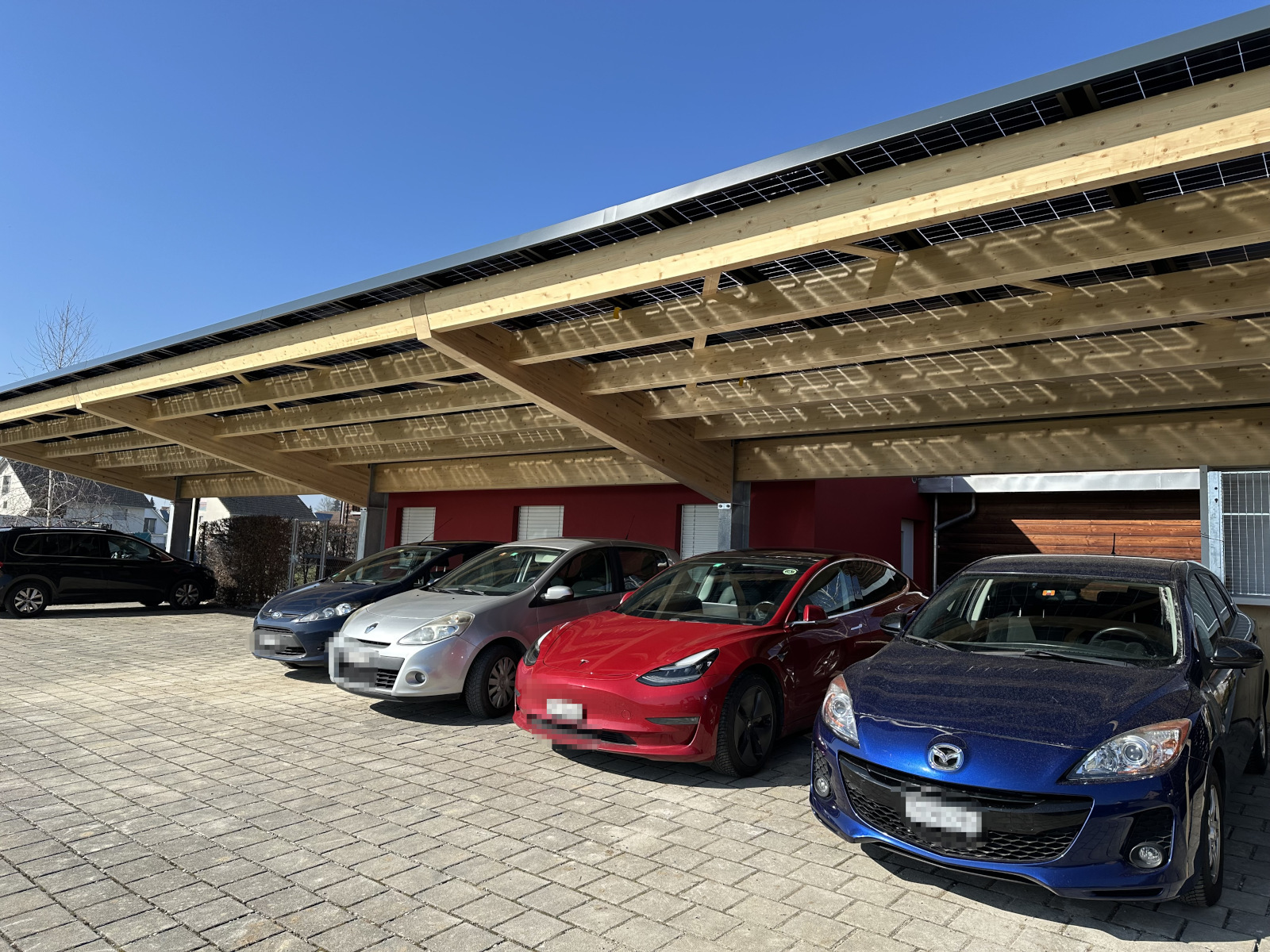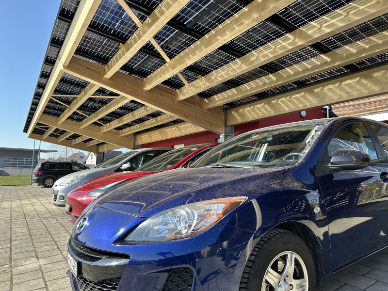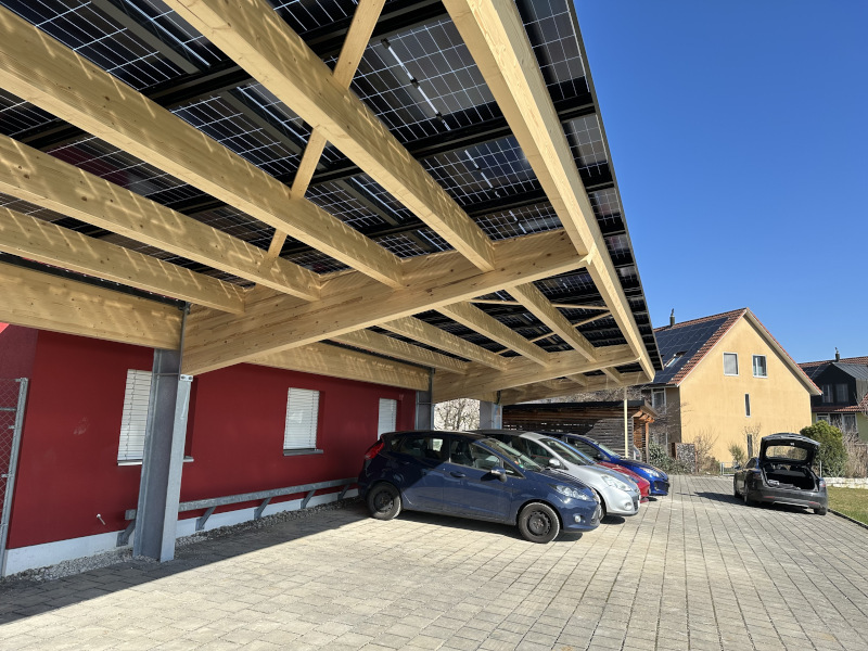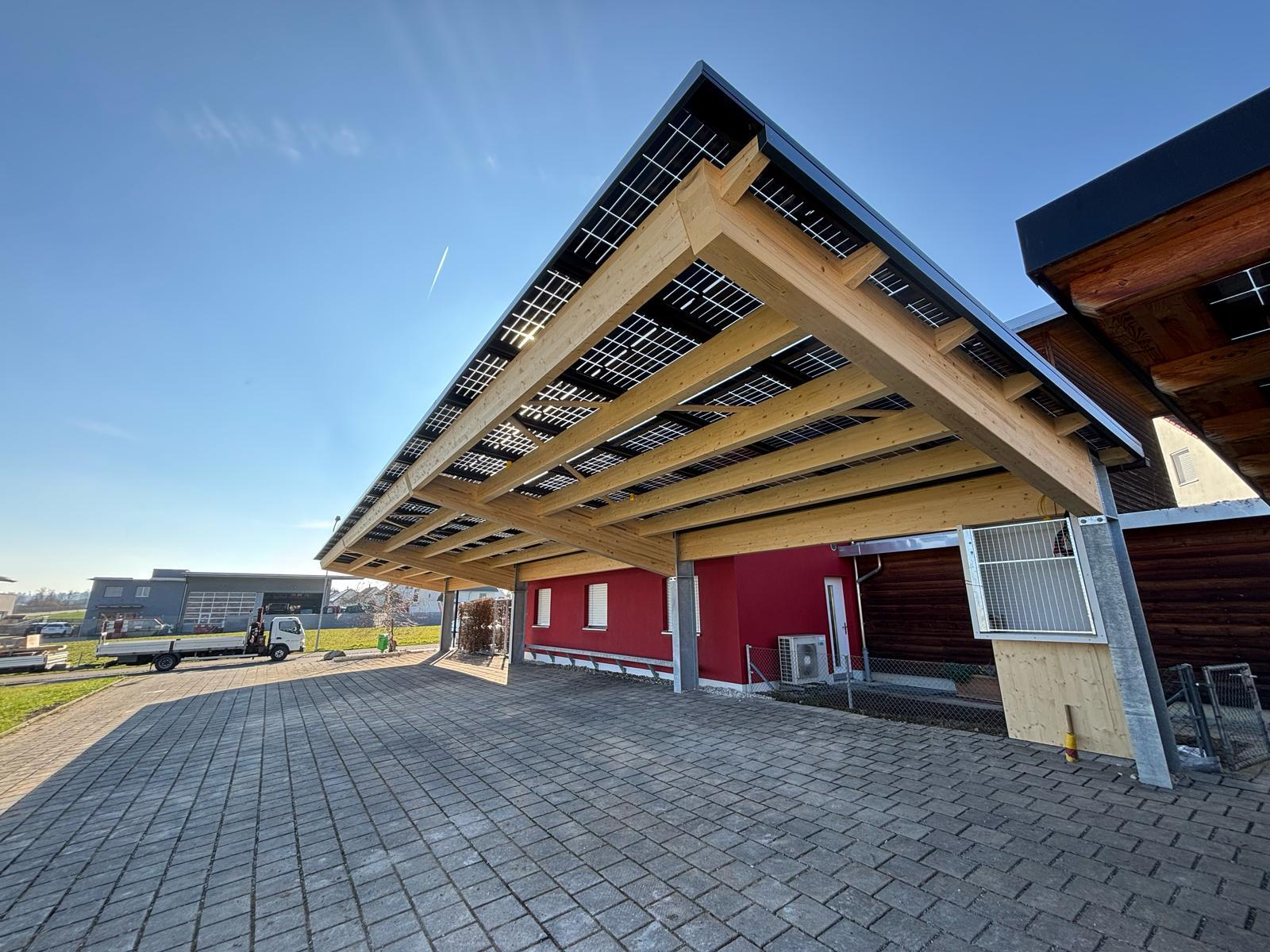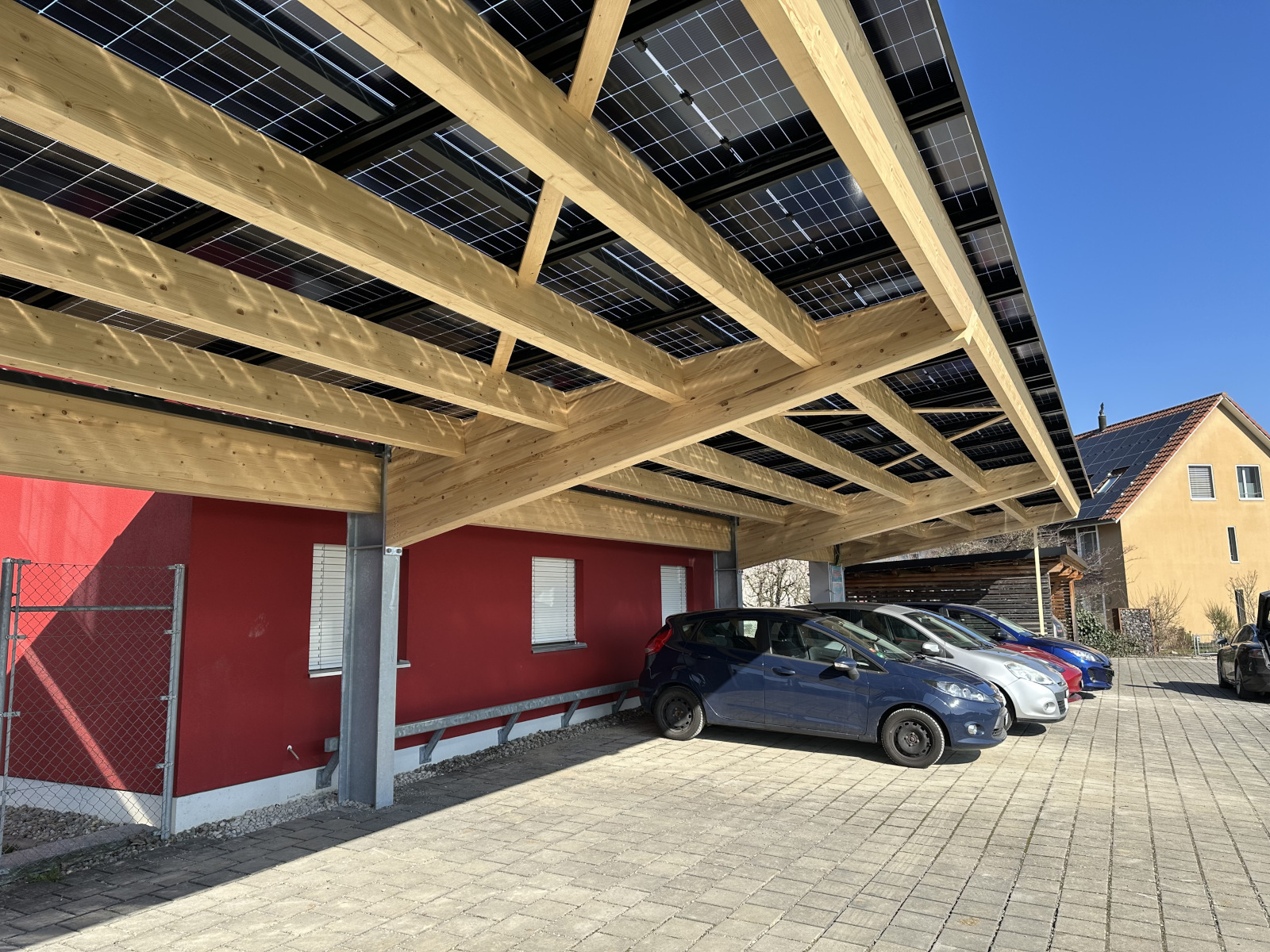 Firmenparkplatz überdacht mit Solarwing single. Holz und Stahlbau. Oberflächenbehandlung der Holzkonstruktion mit Lasur. Stahlkonstruktion Feuerverzinkt. Eindeckung mit PV Indach, bifacial und Transluziden Modulen. Nr.GPP7